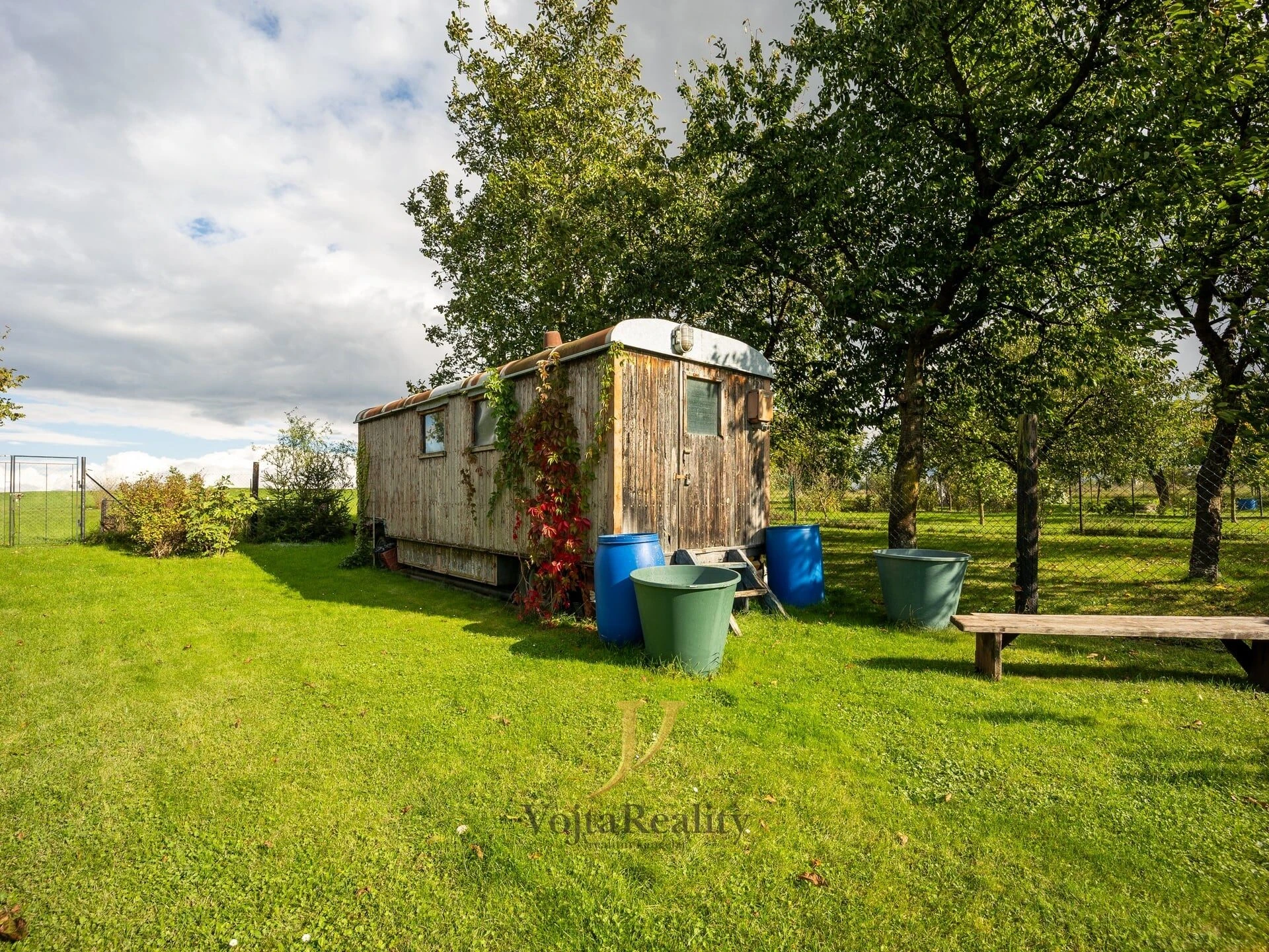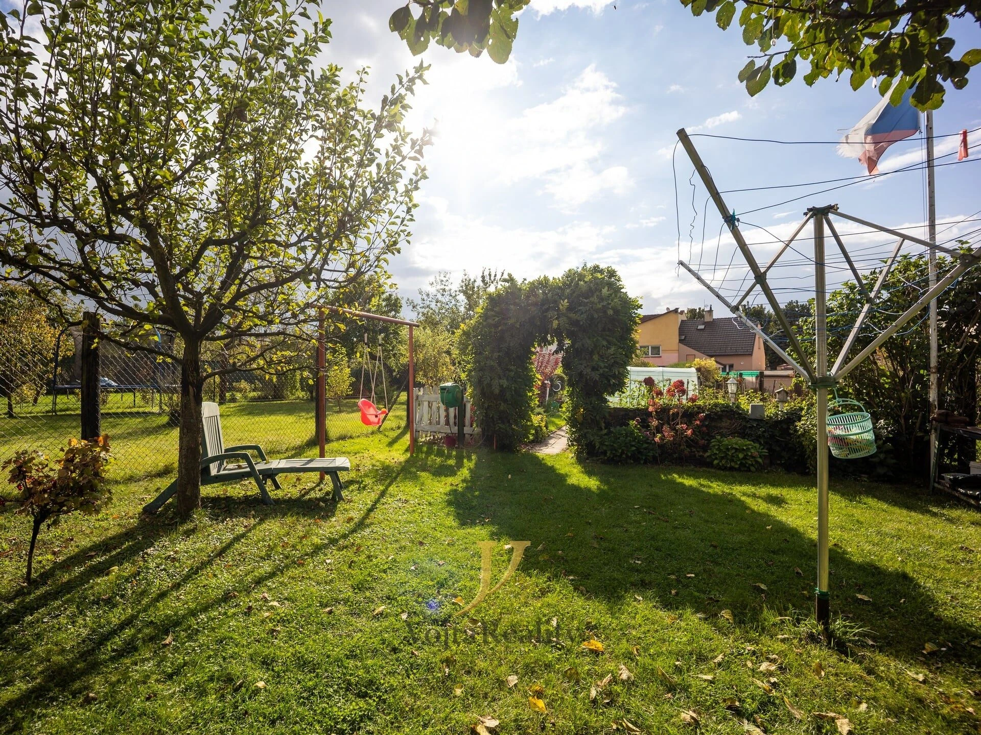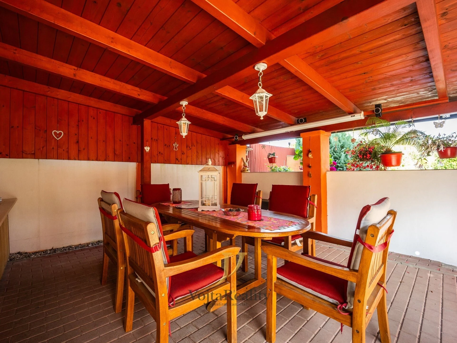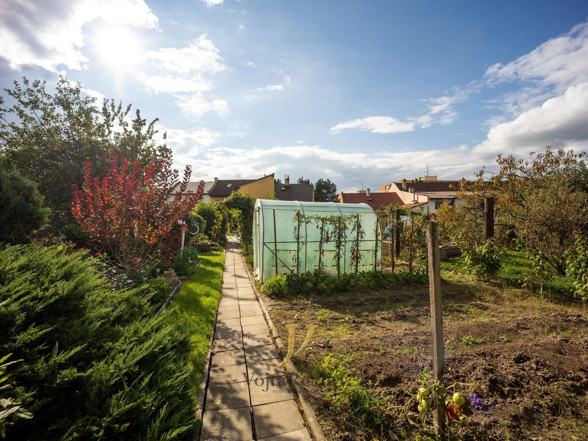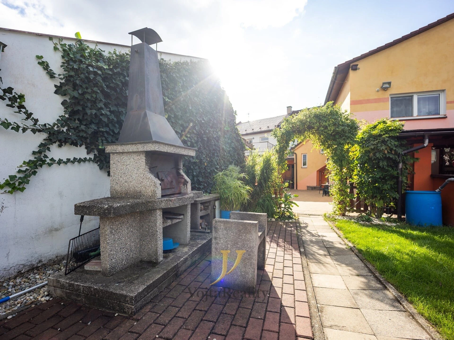 Na vnitroblok domu navazuje funkční zahrada na které se nachází bazén, jezírko pro okrasné ryby a dále pak pěstitelská zóna se záhony, ovocnými stromy a vinnou révou.