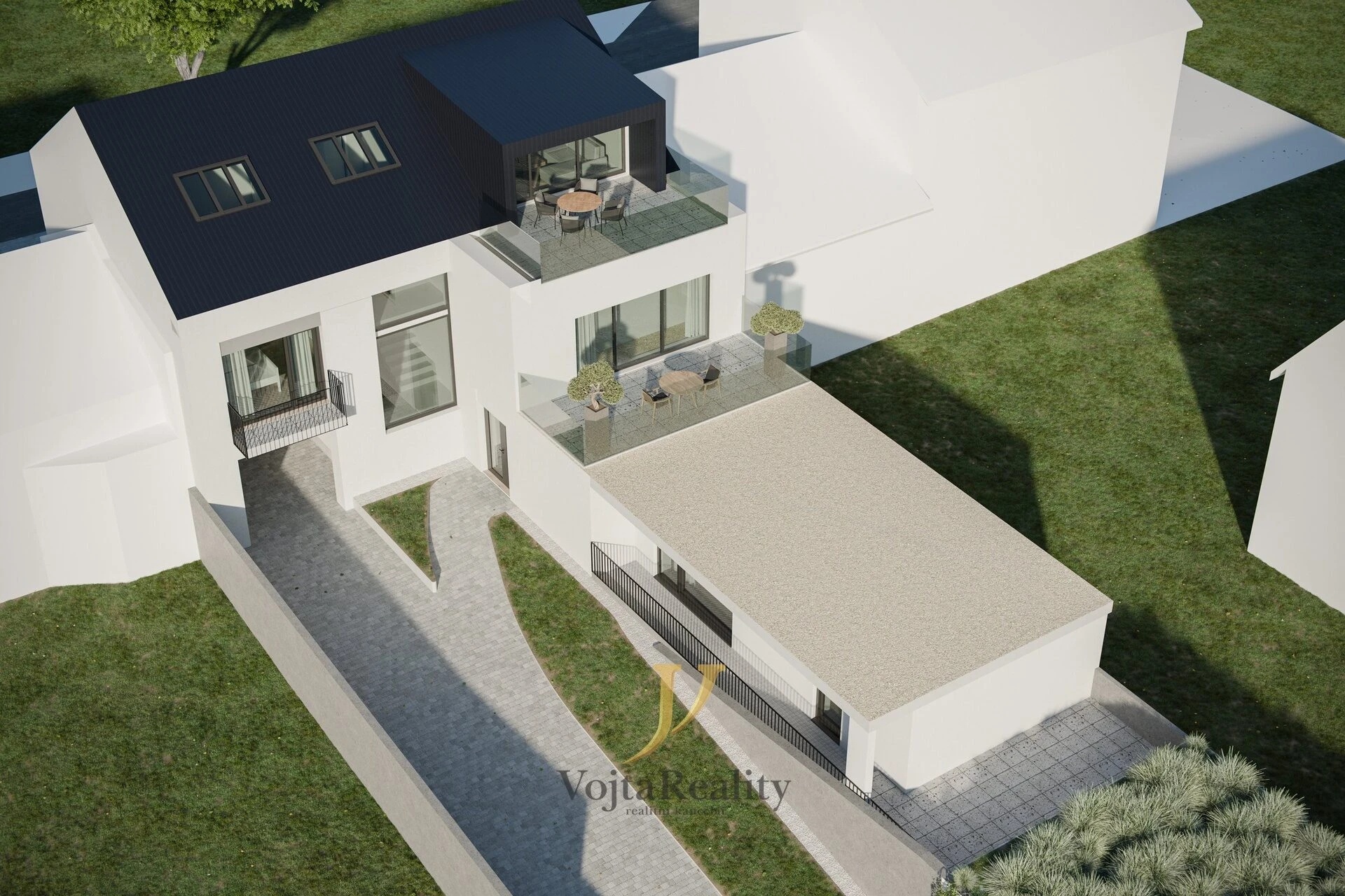 Projekt je připraven k okamžité realizaci včetně kompletní dokumentace. Parkování je zajištěno 3 krytými stáními v polozapuštěném objektu a 2 venkovními stáními na zpevněné ploše.