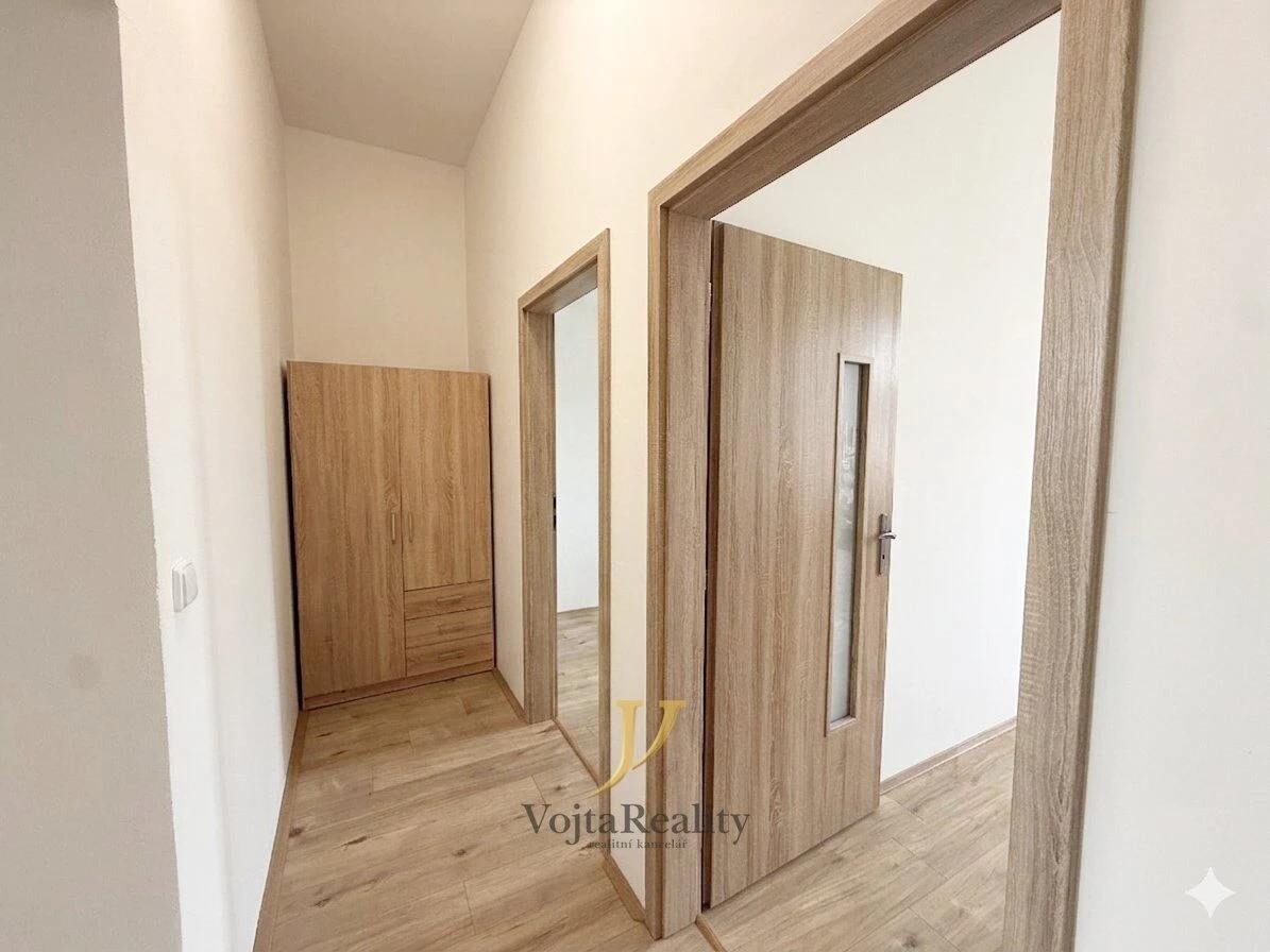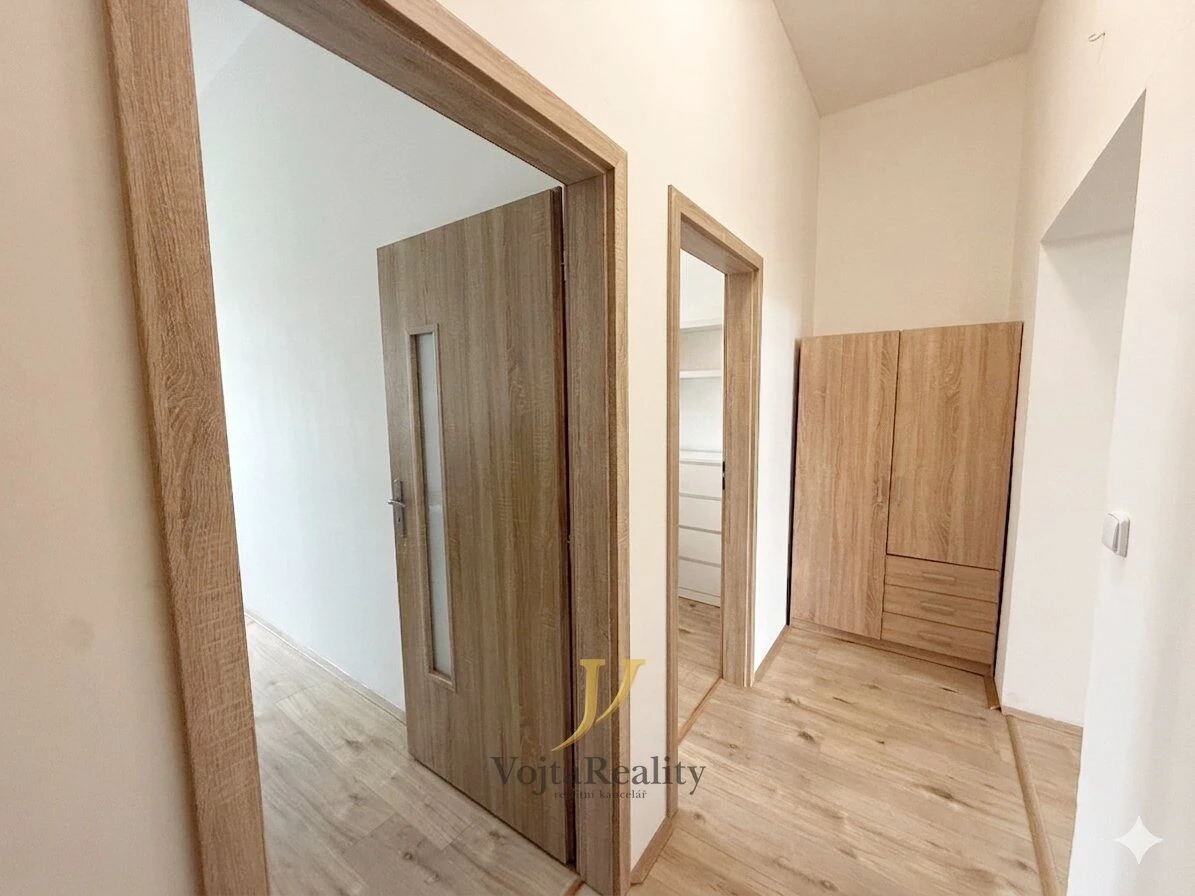 Byt disponuje vstupní chodbou, velkým obývacím pokojem s kuchyňským koutem, dvěma samostatnými pokoji, další chodbou s úložnými skříněmi, koupelnou se sprchovým koutem a samostatnou toaletou s oknem.