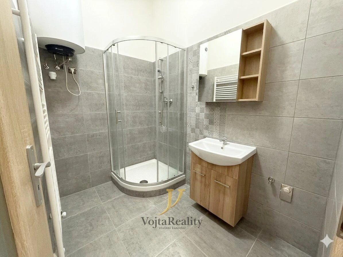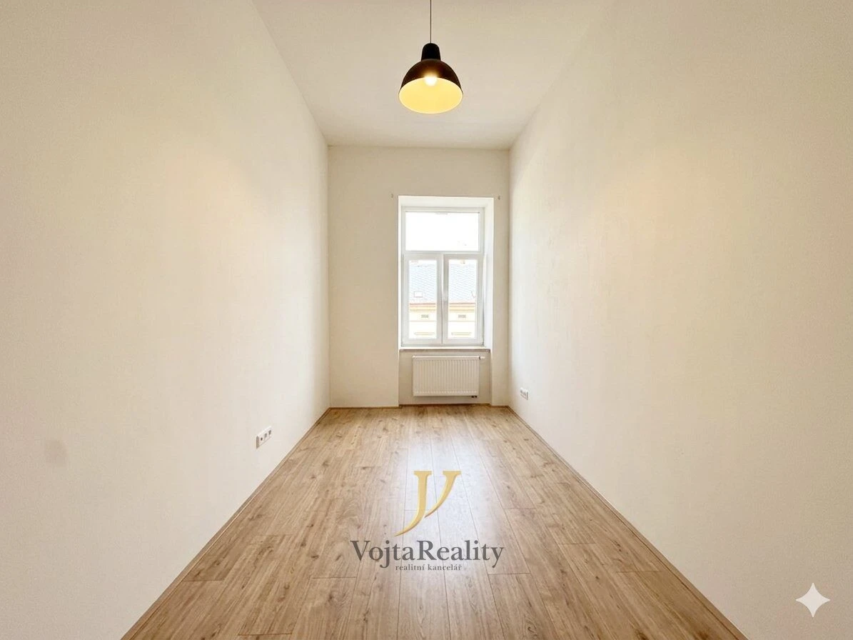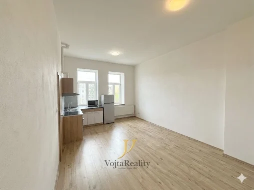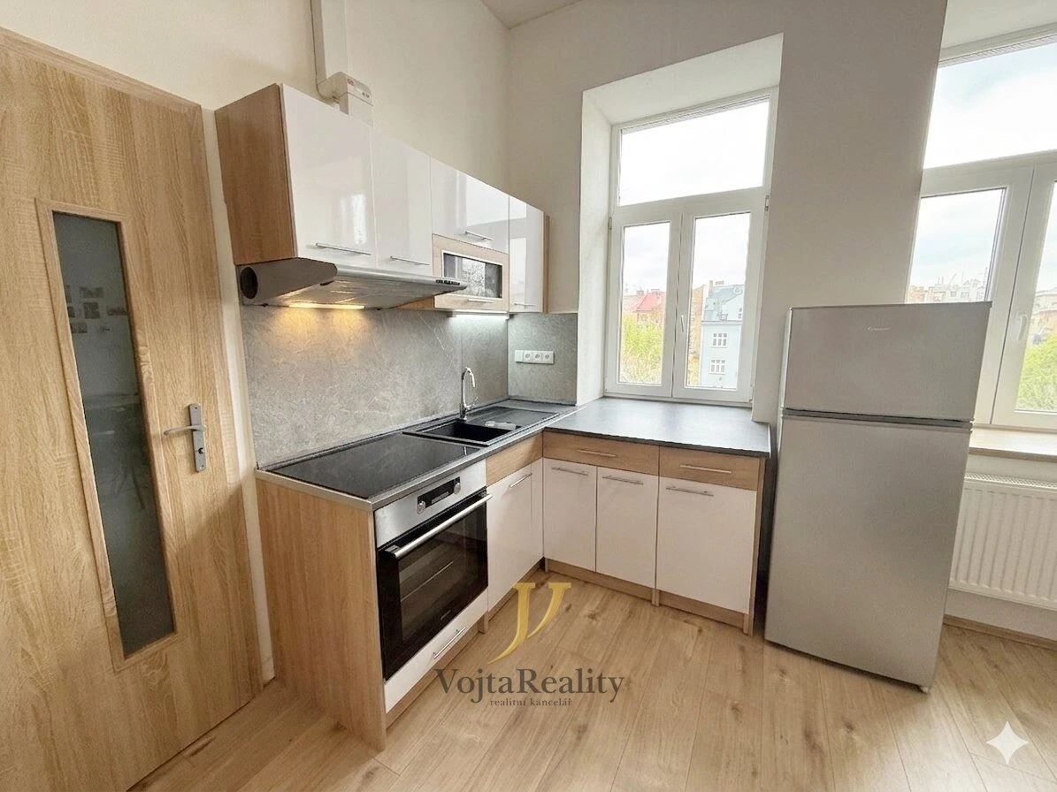 Kuchyňská linka je vybavena troubou, varnou deskou, digestoří a lednicí s mrazákem. V koupelně najdete sprchový kout, umyvadlo s koupelnovou skříňkou a zrcadlem, přípojku na pračku a topný žebřík. Okna v obývacím pokoji vedou do klidného dvorního traktu, který nabízí krásný výhled do zahrad. Podlahy tvoří odolné PVC, plastová okna jsou osazena dvojskly.