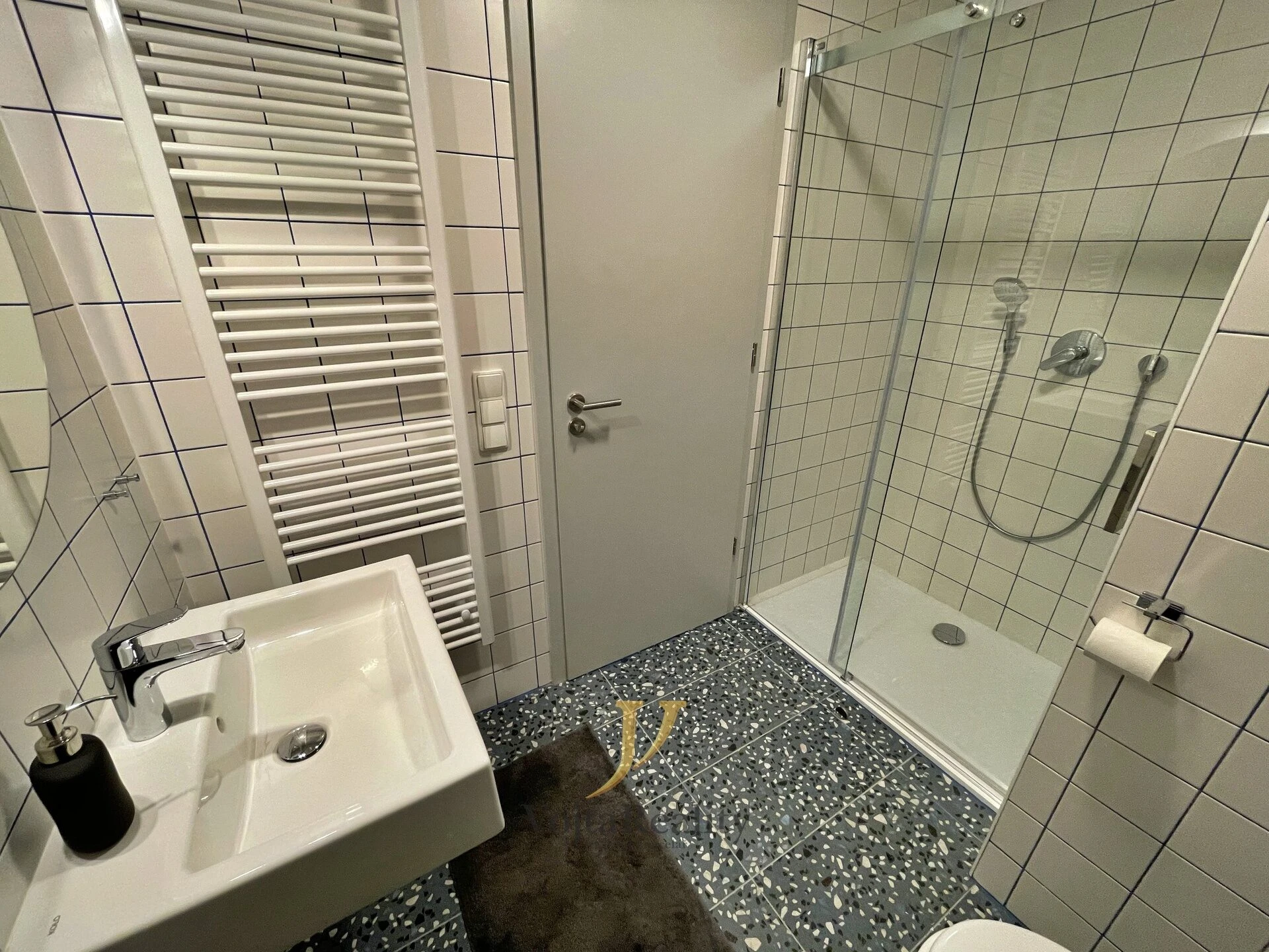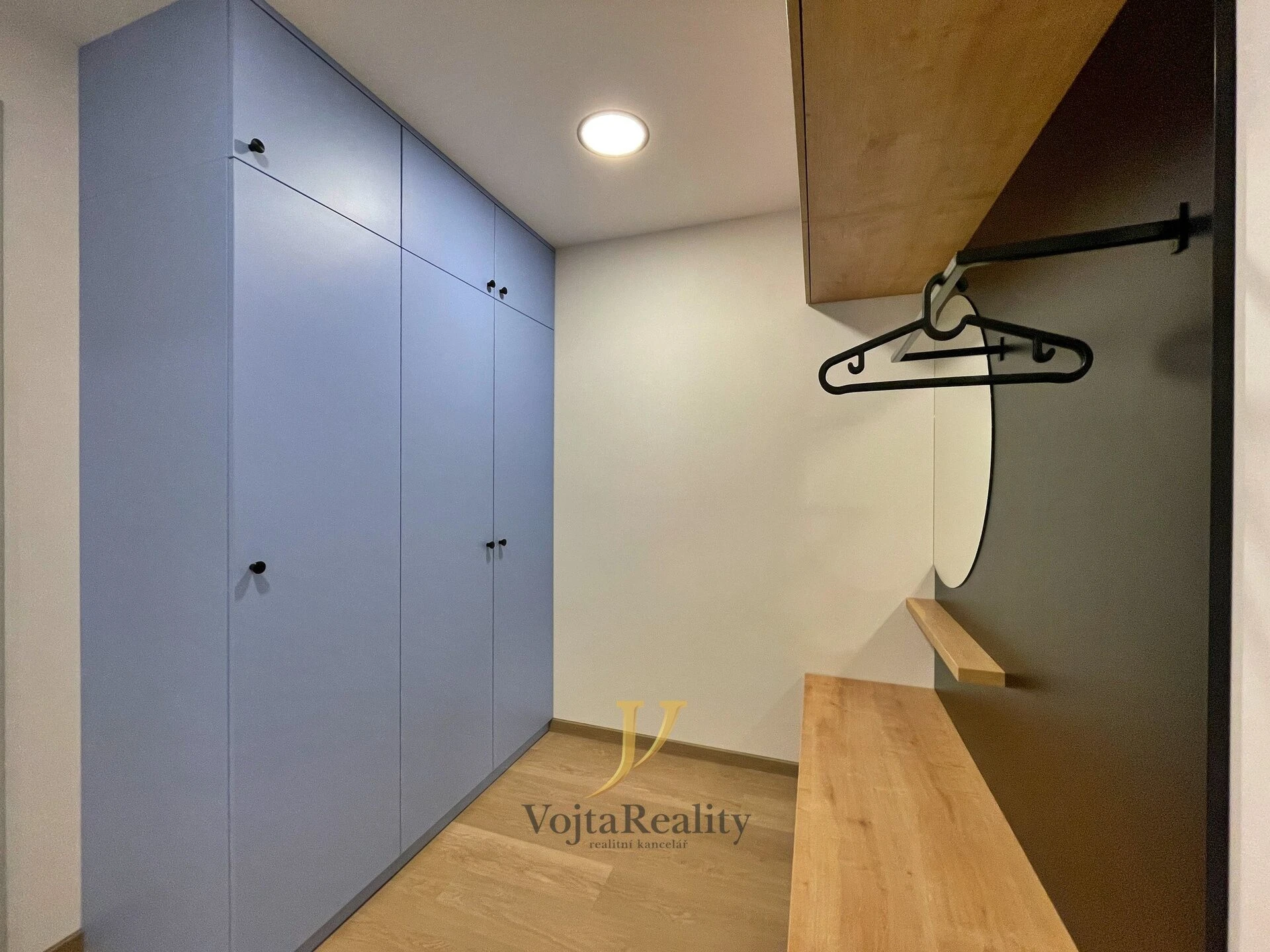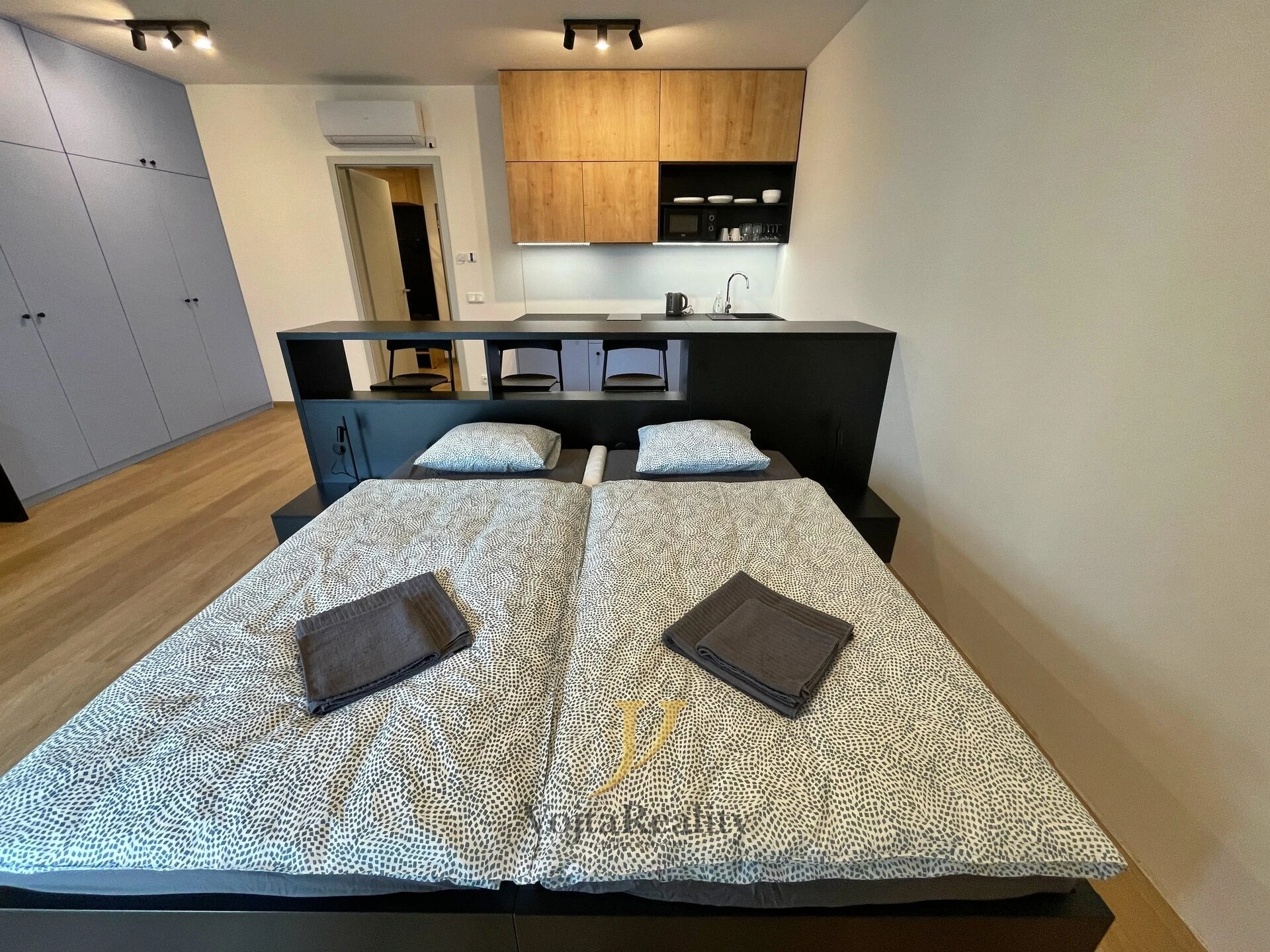 Dispozice bytové jednotky nabízí vstupní chodbu s botníkem a vestavěnou šatní skříní, koupelnu se sprchovým koutem a toaletou a obývací pokoj s kuchyňskou linkou. Kuchyňská linka je vybavena základními spotřebiči (myčka nádobí, dvouzónová indukční varná deska, digestoř, lednička, mikrovlnná trouba).